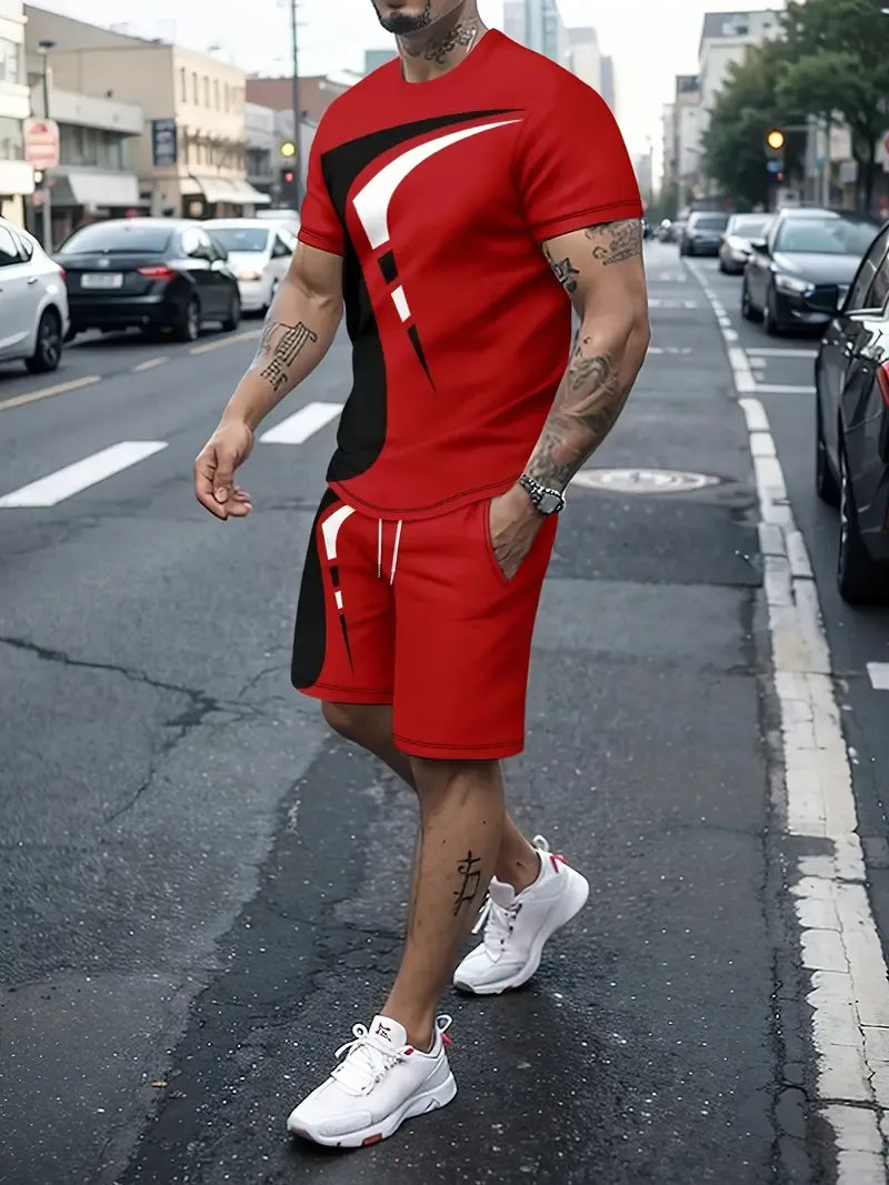 This men's set consists of a round neck t-shirt and drawstring shorts. It is designed for everyday use during warm periods, at the beach, or for light activities. The cut allows for comfortable wear throughout the day.
