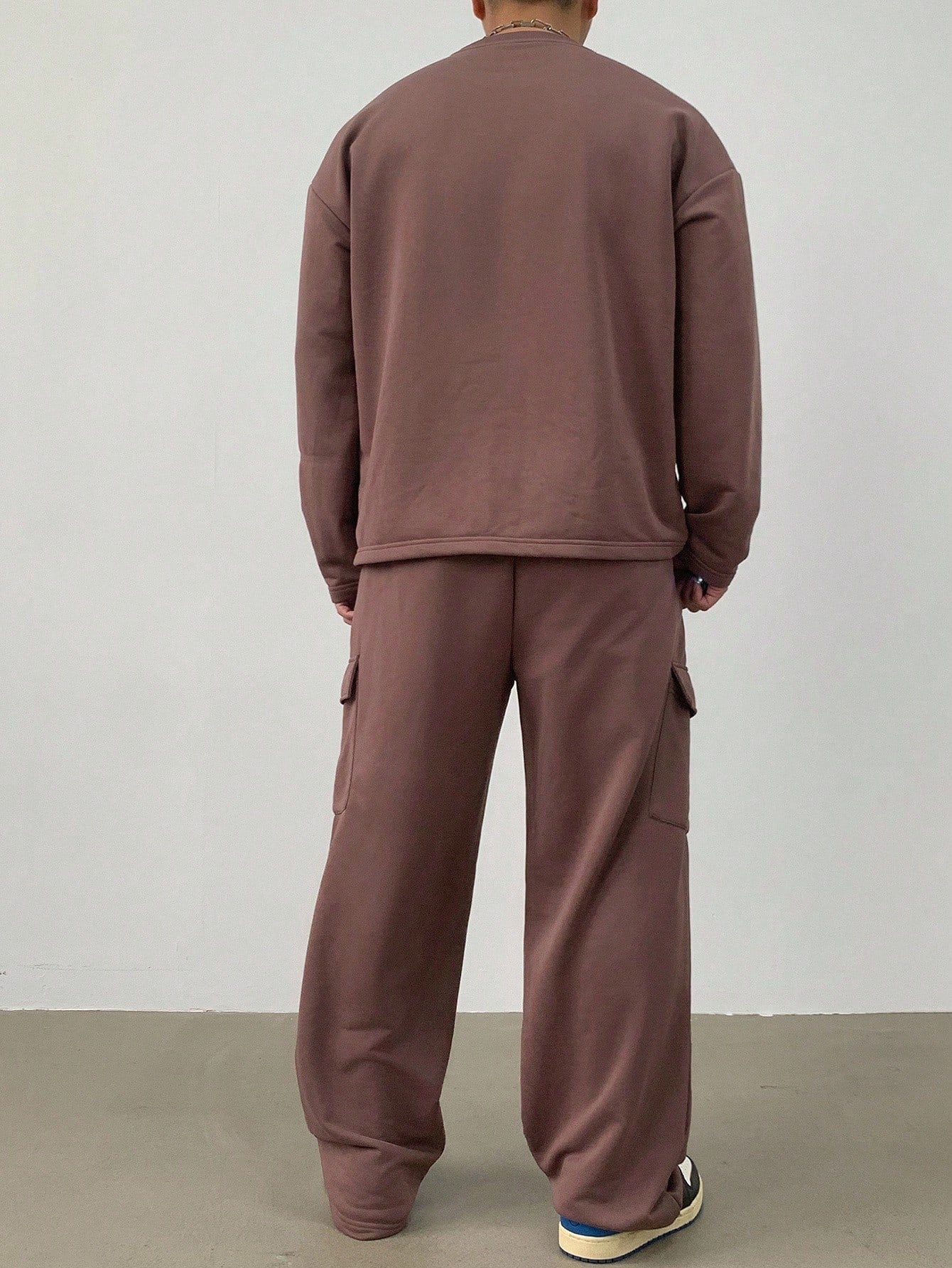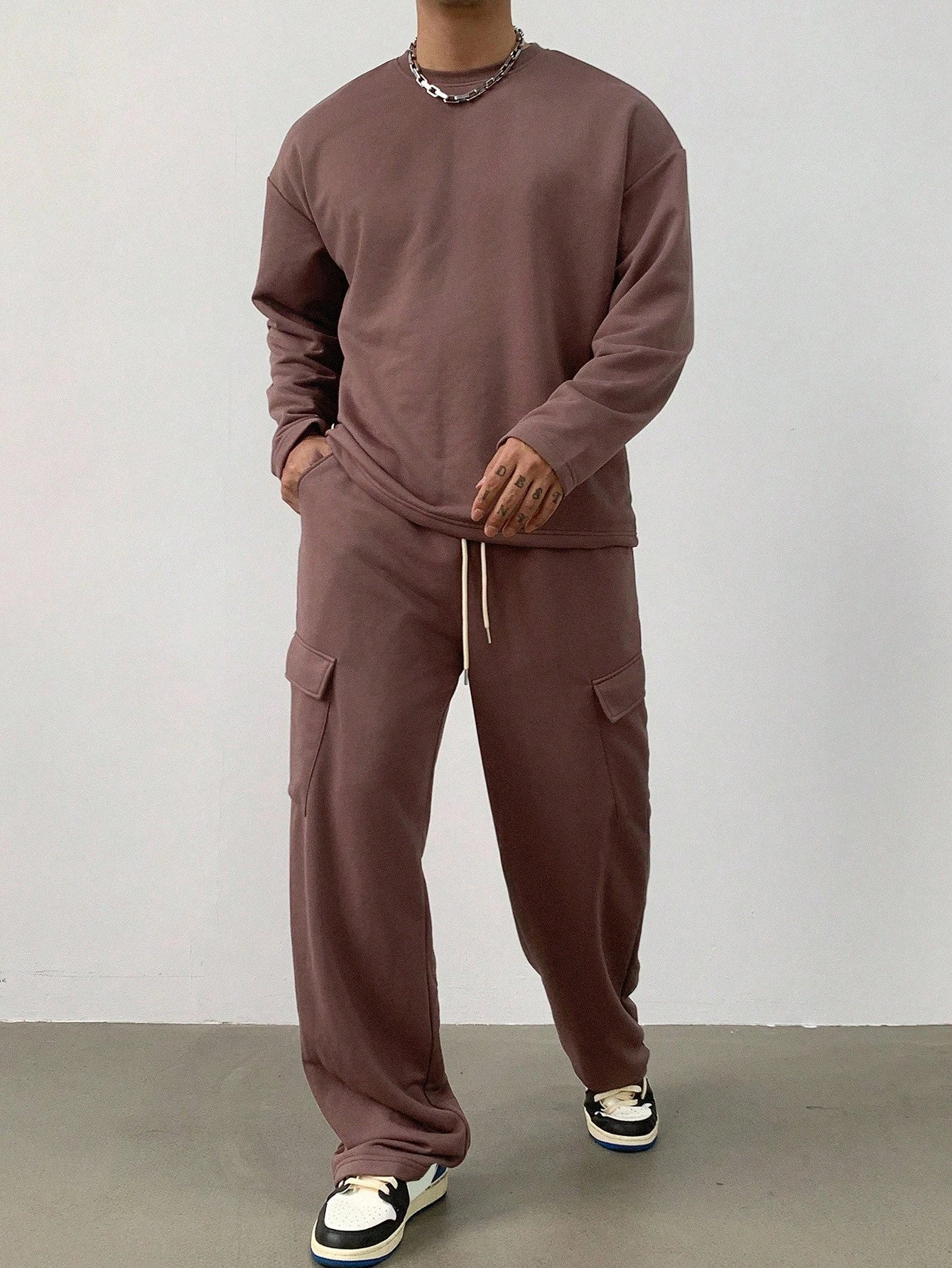 This men's set includes a solid color long sleeve t-shirt and matching cargo pants. Its loose fit allows for comfortable everyday wear. It is suitable for relaxation, home activities, and casual outings.