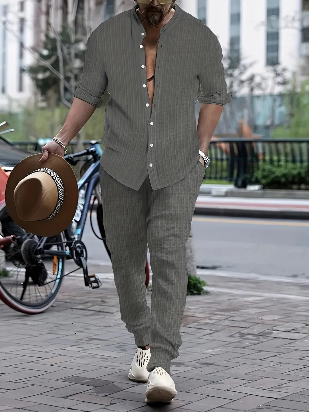 This men's set includes a long-sleeve shirt with front button closure and matching pants. It is designed to be worn in various contexts, such as workdays, city outings, or informal meetings. Its cut allows for comfortable wear throughout the day.
