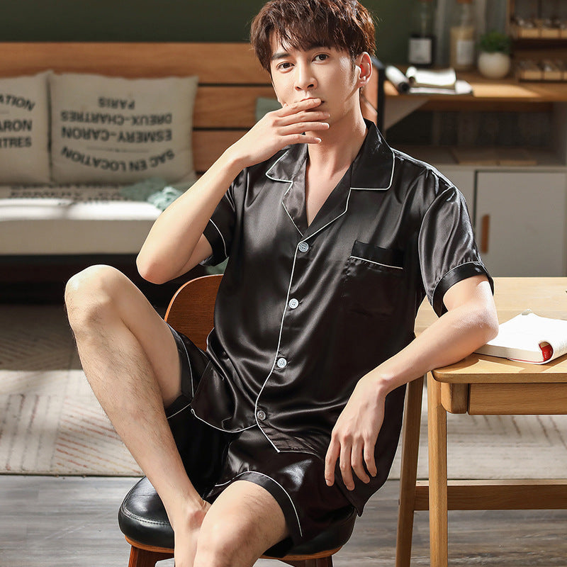 Two-piece set designed to be worn at home during the warm seasons. Includes a short sleeve top and matching pants suitable for relaxation and calm activities. Suitable for men looking for a simple outfit for indoor use or short outings.