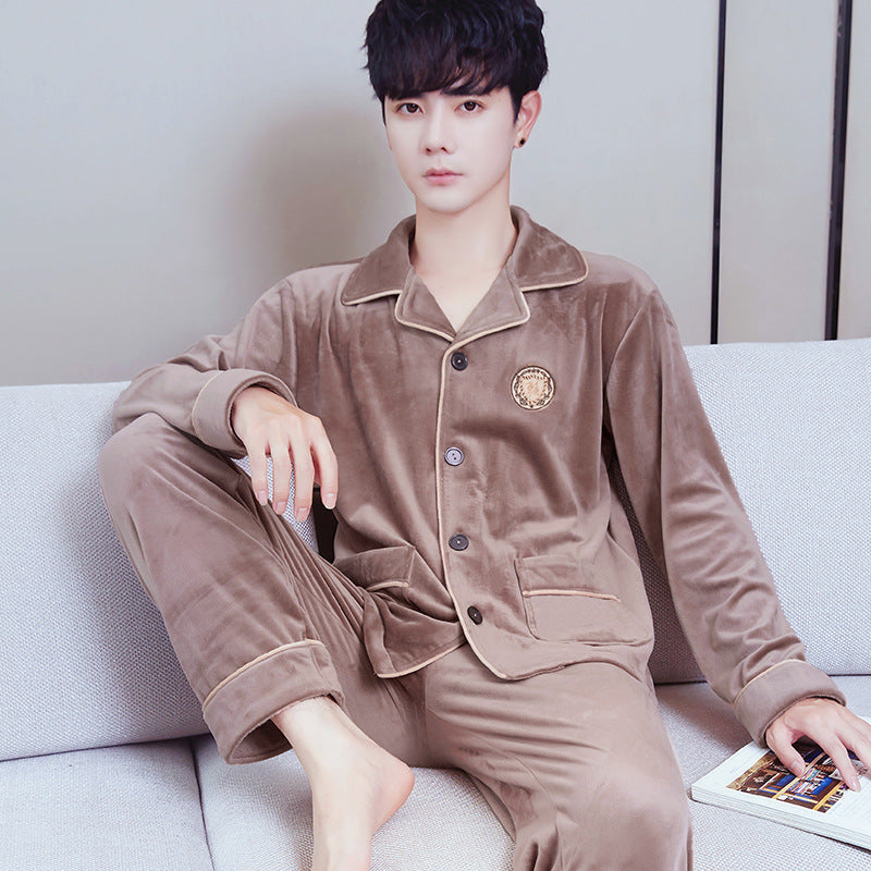This two-piece pajama set for men includes a long sleeve top and pants. It is designed for home use, especially for relaxing moments or as sleepwear. Its design covers the entire body and is suitable for cooler seasons like fall and winter.